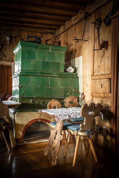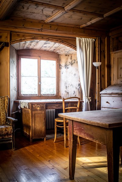 Die Gaststube aus Arvenholz erstrahlt in ihrer ganzen alten Pracht. Tische und Stühle im Restaurant sind die gleichen wie zuvor, auch die Russküche ist unverändert und bietet Platz für acht Gäste.