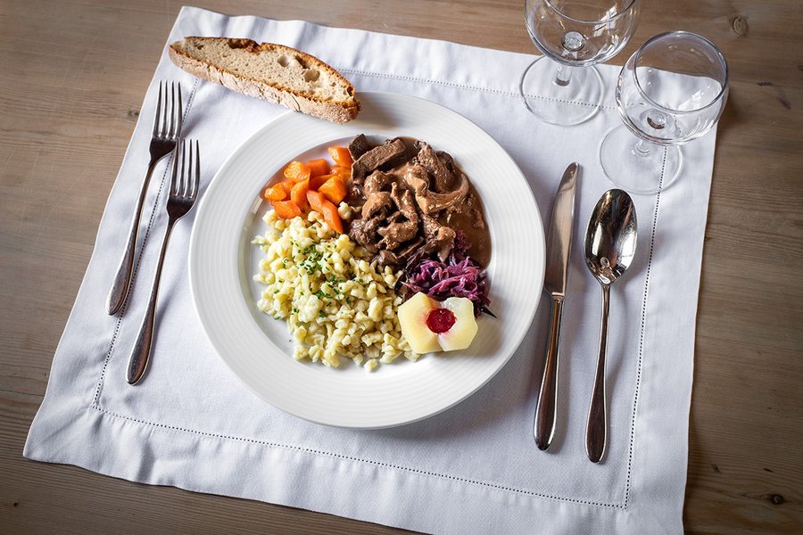 Verkochen, was da ist. Rund ums Jahr bietet die Natur ihr Füllhorn an Gemüse und Früchten. Das Kalb von Bio Bauer Isidor Sepp verarbeitet der Südtiroler von der Nase bis zum Schwanz. Kräutlein und Gräser sind ein Must in Olivers Küche. Zudem liebt er es, Teigwaren, Schlutzkrapfen oder Gebäck mit Aprikosen und Äpfeln von A bis Z selber zuzubereiten.