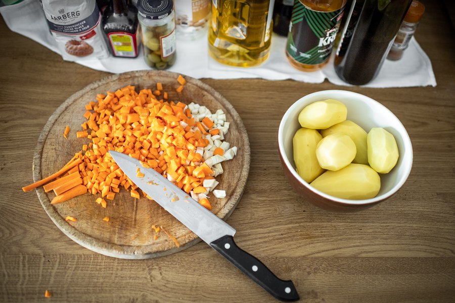 In der Küche sind flinke Hände und ein gutes Zusammenspiel gefragt. Daniela greift sich Teller für Teller und das Handwerkszeug, das Oliver braucht.